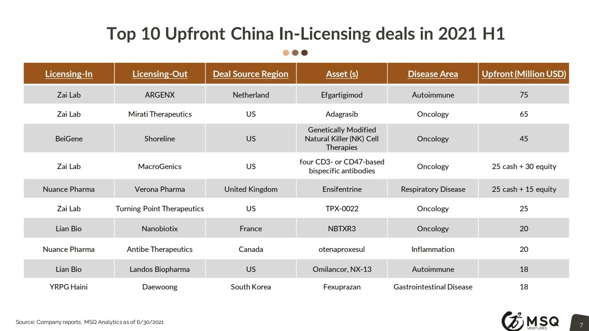 The cross-border licensing activities kept up with good momentum. Although the majority lies in the in-licensing efforts of China biopharma, China out-licensing (14 closed in 2021 H1) is steadily boosted, opening a new era for China biopharma deals, transition from “China for China”, to “China for global”.